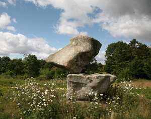 My monumental sculptures are created using a large crane to reposition the balancing stone. By re-stropping the stone (moving the supporting straps) it is possible to change its orientation over the point of contact until balance is achieved.